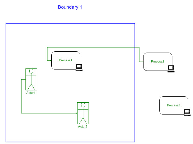 When sending a model from Visio to Archi, you may want to automatically create a relationship between items when the one is fully contained within the other. The illustration on the right shows an example of this; When the Visio VBA code sends this information to Archi via the Archi Requester, it will automatically detect that Actor1, Actor2 and Process1 are fully contained within Boundary1. This relationship information will be sent to Archi using the reserved phrase "Fully Contained" for the Visual Reltype name. Should you wish these relationships to be mapped in the Archi repository, simply add the following XML to your model type: